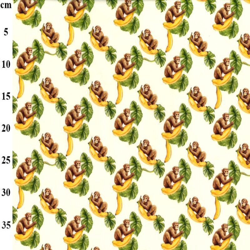 A playful design featuring monkeys sitting on bright yellow bananas among lush green tropical leaves. The soft off-white background makes the colours of the monkeys and foliage stand out beautifully.