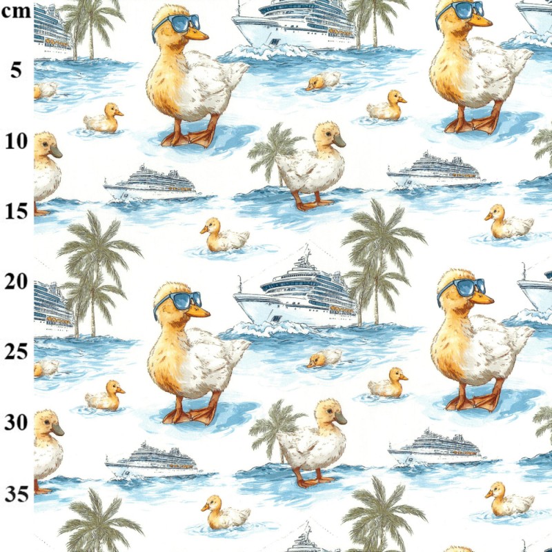 A fun and playful nautical-themed design featuring cheeky yellow ducklings, some sporting sunglasses, alongside cruise ships, palm trees and smaller duck details. The elements repeat across a stylised water background, creating a light-hearted seaside scene with plenty of character. The colour palette mixes white, blue and yellow with softer browns and greens, keeping the design bright without being overwhelming.