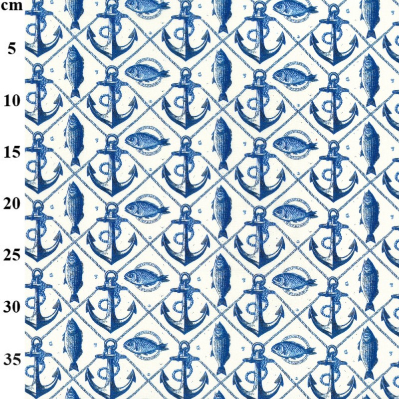A charming nautical design featuring repeating anchors and fish arranged within a diagonal rope grid. The blue-on-white colour palette gives the fabric a crisp, classic maritime feel. The pattern is evenly spaced, creating a clean and structured repeat that works well for a range of projects.
