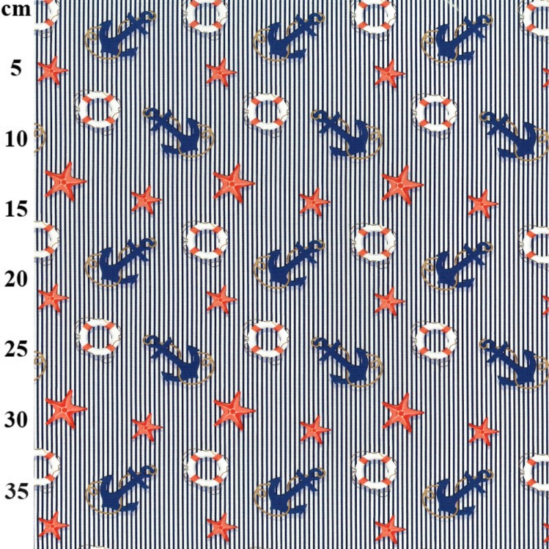 A playful nautical-themed fabric featuring navy blue anchors with gold ropes, red starfish, and white and red life rings. The pattern sits on alternating vertical navy and white stripes, giving a crisp, maritime feel. Its vibrant colours and whimsical design bring a sense of fun and adventure to any project.