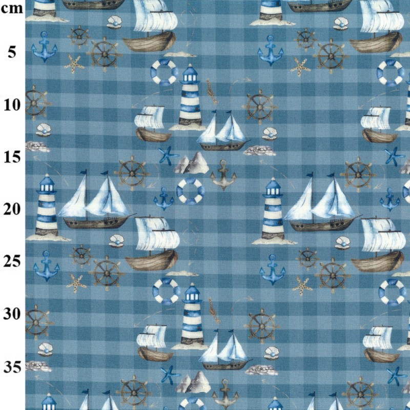 This nautical fabric showcases a lively repeating design set over a blue and white checkered background, filled with familiar seaside motifs. Sailboats with white sails, striped lighthouses, anchors, ship wheels, life rings, shells, starfish, and small island details are scattered evenly across the surface, creating a balanced and playful maritime theme.