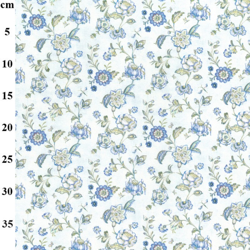 Scattered throughout the design are small butterflies and dragonflies, adding subtle detail and a touch of movement without overwhelming the pattern. Printed on 100% cotton poplin, the fabric has a smooth handle and light drape, making it suitable for a wide range of sewing projects where a classic floral look is desired.