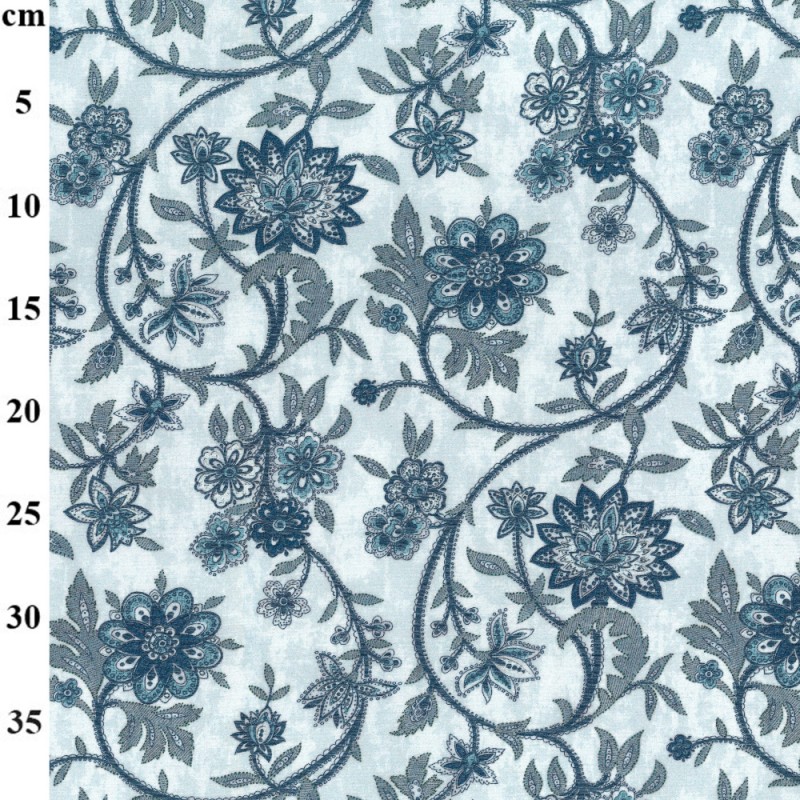 This design features a flowing floral and foliate pattern set against a light blue background with a subtle textured look. The print combines ornate, detailed flowers with smaller blossoms and leaves, all linked by winding stems that create a soft, organic movement across the fabric. The palette of blues and gentle greys gives the design a classic, vintage-inspired feel without looking heavy.