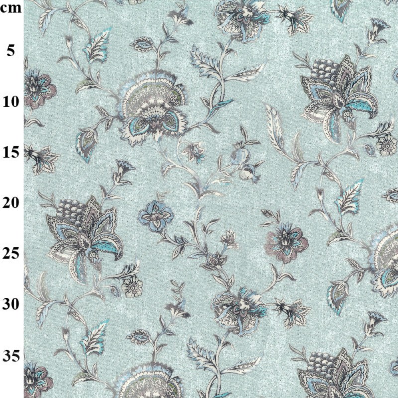 This fabric showcases a classic floral pattern set on a soft light blue background, with stylised flowers and flowing foliage connected by winding stems. The flowers are multi-layered with fine detailing, balanced by leaves in varied shapes that add movement and depth to the design. Subtle tones of blue, grey, teal, and gentle brown accents give the fabric a timeless, vintage-inspired look that feels calm and elegant.