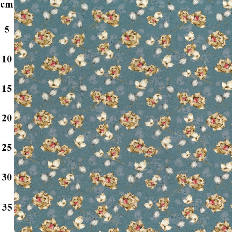 This design features a scattered floral pattern with a relaxed, natural flow, combining layered multi-petalled blooms with smaller, simpler flowers for contrast. Delicate stems and leaves weave between the florals, creating a balanced, organic look that feels timeless rather than formal. The overall layout gives the fabric an easy, wearable charm that works well across a wide range of projects.