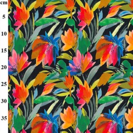 The Rose & Hubble Beaufort Road Cotton Poplin is a bold, contemporary floral featuring expressive, painterly tropical blooms. Large, vibrant flowers in striking shades of orange, red, pink, blue and green create a dramatic statement design with a beautiful watercolour effect.