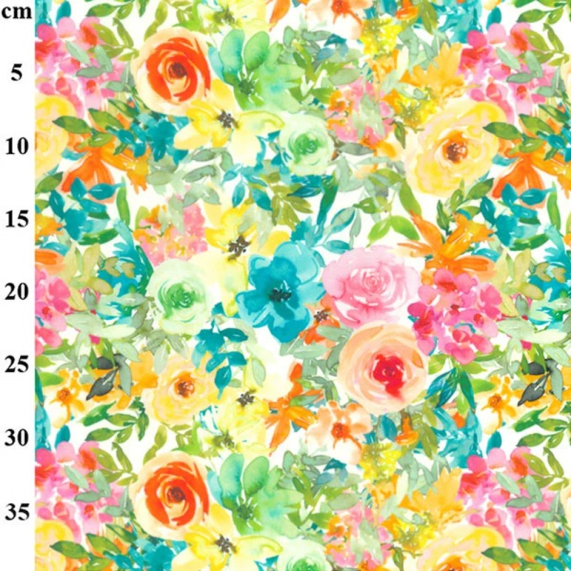 The Rose & Hubble Edward Street Cotton Poplin showcases a vibrant watercolour floral design bursting with colour and movement. Large painterly blooms in shades of coral, yellow, blush pink, teal and fresh green leaves create a lively, uplifting print with a soft artistic finish.