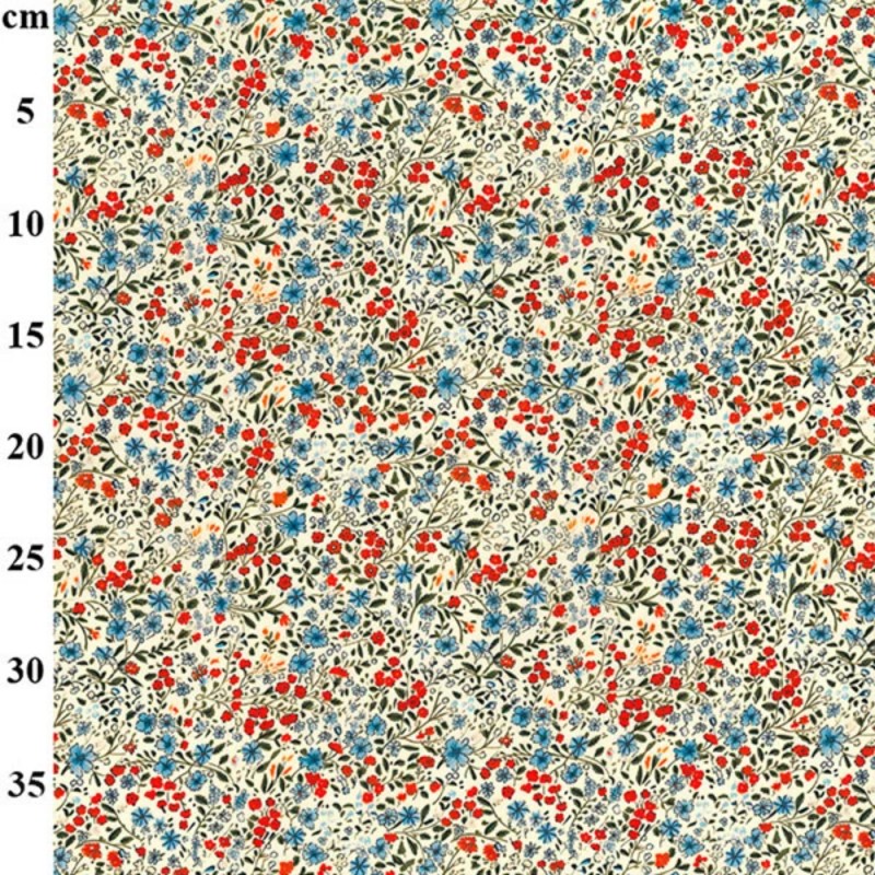 The Rose & Hubble Harris Road Cotton Poplin features a delicate ditsy floral print with intertwining stems and scattered blossoms. Small red and blue flowers are set amongst soft green foliage on a light cream background, creating a timeless countryside-inspired design with a classic vintage feel.