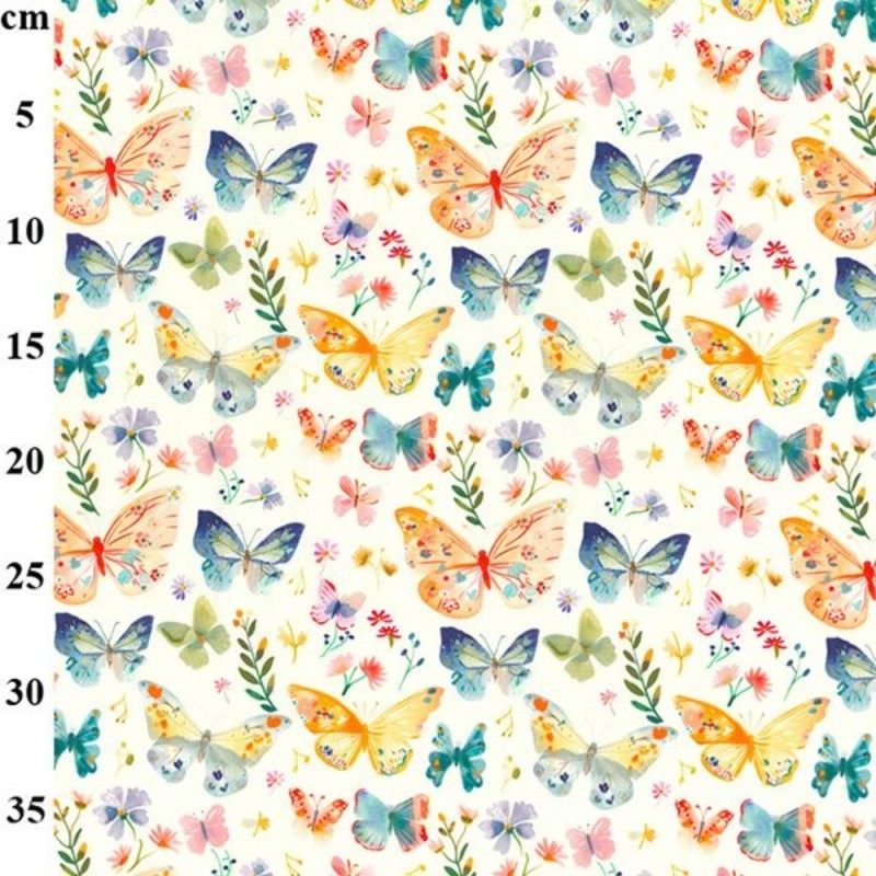 The varied butterfly sizes and gentle watercolour effect give this fabric a whimsical yet elegant feel, making it ideal for projects that call for colour without overpowering detail. The balanced layout ensures versatility for both garments and craft makes.