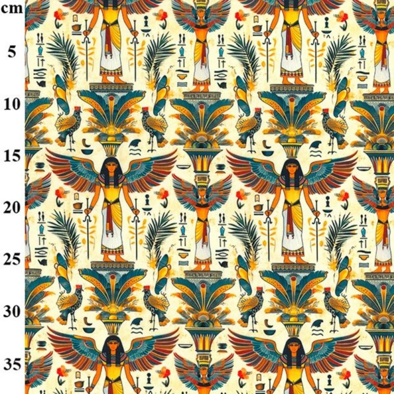 This striking Ancient Egyptian cotton poplin fabric features a bold repeating design of winged goddesses, decorative columns, sacred birds, palm motifs and detailed hieroglyphics. Rich tones of gold, teal, burnt orange and deep blue stand out beautifully against a parchment-style background for a strong historical aesthetic.