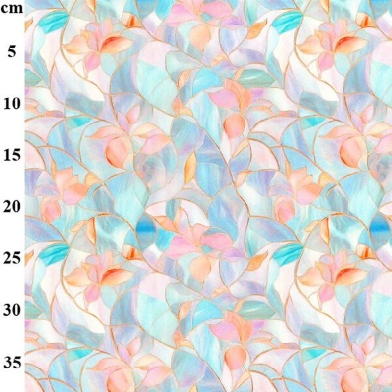 Centaur Road is a beautifully soft Art Nouveau inspired cotton poplin featuring flowing florals and sweeping botanical curves in a delicate pastel palette. Shades of aqua, sky blue, blush pink, peach and cream blend seamlessly together, outlined with fine golden-style lines that create a stained-glass effect.