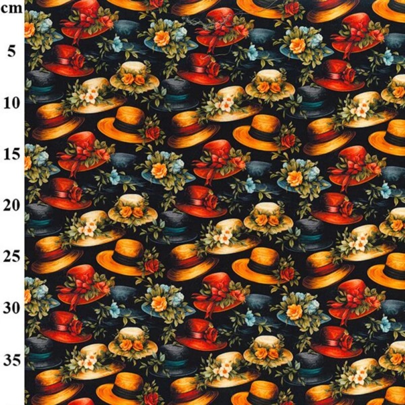 The repeating hat and floral arrangement creates a bold, statement print perfect for distinctive garments and craft projects.