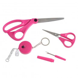 This practical 4-piece cutting set is ideal for all your sewing needs. It includes a pair of 21cm (8.5in) dressmaking scissors, 11.5cm (4.5in) embroidery scissors, a 150cm (60in) tape measure, and a premium quality seam ripper with safety ball. The scissors feature quality, comfortable grip handles for ease of use and precision cutting. The set comes in an eye-catching pink color, perfect for your sewing toolkit.
