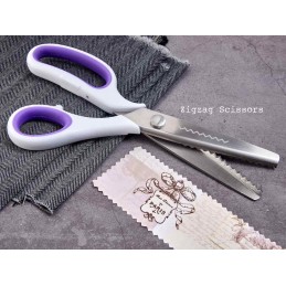 high-quality stainless steel pinking shears, each with comfortable soft-grip handles for ease of use. three popular cut styles: zig zag cut with purple handles, wave cut with yellow handles, and scallop cut with pink handles. These durable pinking shears are ideal for crafting and sewing projects, helping to reduce fabric fraying with their precision-cut edges. Wipe clean only.
