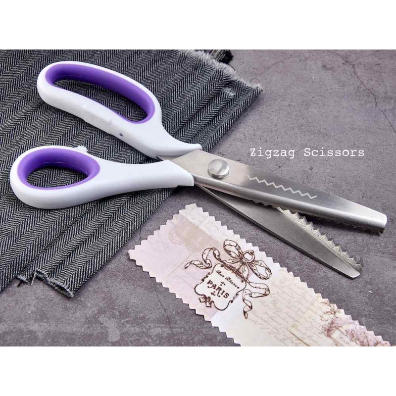 • Three popular pinking cuts included: zig zag (purple handles), wave (yellow handles), scallop (pink handles)