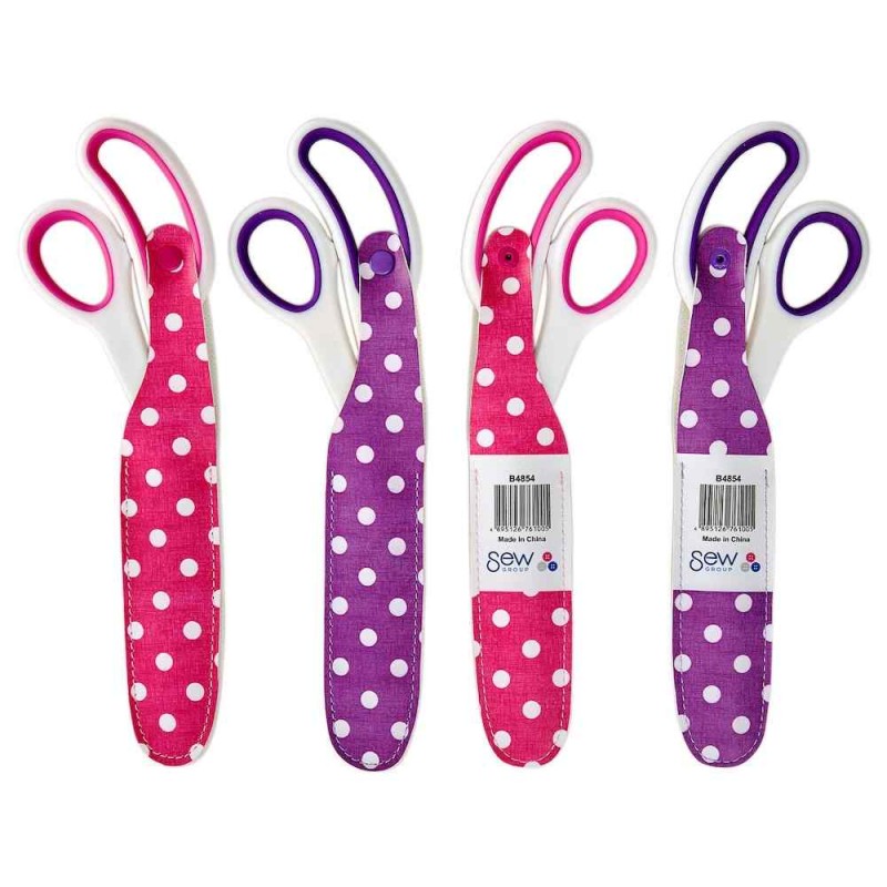These 24.5cm scissors combine comfort and safety with high-quality stainless steel blades and a soft grip handle. Each pair comes in a protective polka dot pouch with a convenient snap closure, making them easy to store and carry. Available in pink or purple handles, these scissors provide excellent control for all your sewing, crafting, and general cutting needs. The durable design and soft grip ensure comfortable use for extended periods.