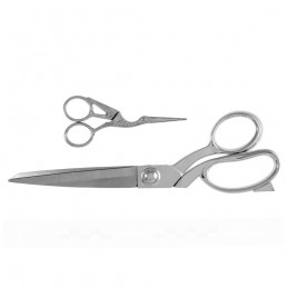 Beautiful Milward gift set featuring high-quality metal dressmaking scissors (25cm/9.8in) with sleek silver-coloured handles paired with coordinating ‘stork’ embroidery scissors (11.5cm/4.5in) also in silver-coloured handles. A perfect stylish addition to any sewing box and an ideal gift for any sewing enthusiast.