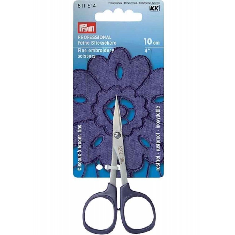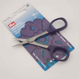 Fine point embroidery scissors from the Prym Professional range, crafted for intricate and precise cutting in embroidery and lace work. These dainty scissors feature razor-sharp, rust-proof stainless steel blades that ensure millimeter precision cutting up to the stitches. Designed for both right and left-hand users, they offer comfort with generously sized handles, making them an essential tool for any embroidery enthusiast or professional. Perfect for detailed work such as Richelieu embroidery (whitework) or pulled thread techniques.
