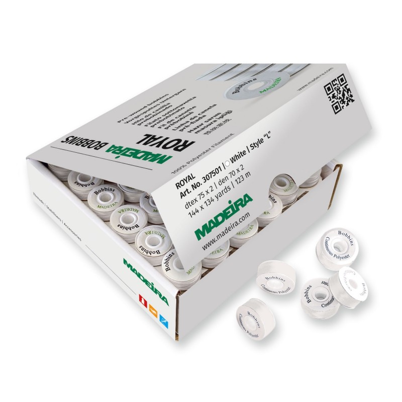 The Madeira Royal Pre-Wound Bobbins provide a convenient and professional solution for machine sewing and embroidery. This box contains 144 pre-wound bobbins, each filled with 123 metres of high-quality 100% polyester filament thread.