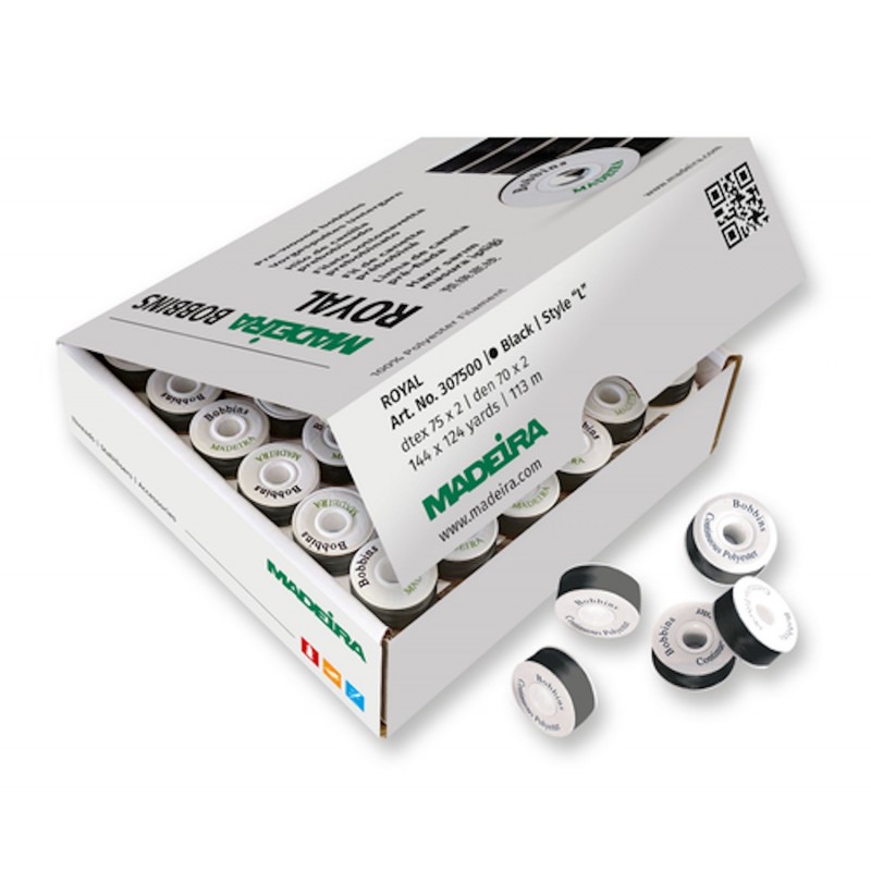 The Madeira Royal Pre-Wound Bobbins provide a convenient and professional solution for machine sewing and embroidery. This box contains 144 pre-wound bobbins, each filled with 123 metres of high-quality 100% polyester filament thread.
