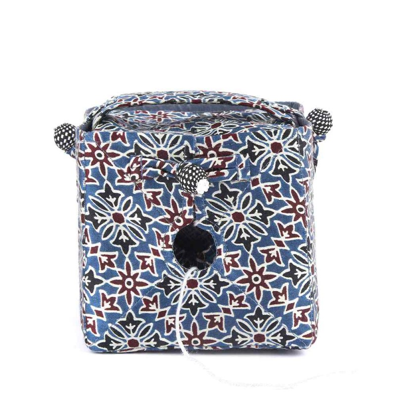Place your yarn ball inside the Knit Out Box, pull the yarn through the keyhole opening, and close the lid to keep your yarn clean and tangle-free. Use the handles for easy transport to your crafting spot or when traveling. To maintain the beauty of the Ajrak fabric, spot clean with a damp cloth as needed.
