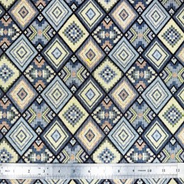 Make a bold design statement with NWF099 – Little Aztec Azure, a stunning geometric tapestry from the New World Tapestry Full Colour (NWF) range. Featuring interlocking diamonds, stepped patterns and intricate mosaic-style details in shades of navy, sky blue, denim, cream and touches of warm sand, this fabric brings a modern yet timeless look to any interior or crafted item.