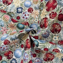 Create stunning festive projects with this luxury Christmas baubles tapestry fabric, featuring a rich mix of decorative ornaments, stars and winter foliage in traditional seasonal colours. The intricate woven design is enhanced with lurex yarn, adding a subtle sparkle that catches the light beautifully.