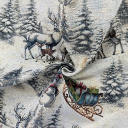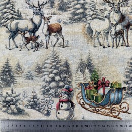 Capture the beauty of a winter wonderland with this luxury snowman tapestry fabric, featuring detailed scenes of snowmen, reindeer, sleighs and snowy forests set against a soft natural background. The design evokes a classic festive countryside feel, perfect for seasonal makes.