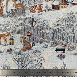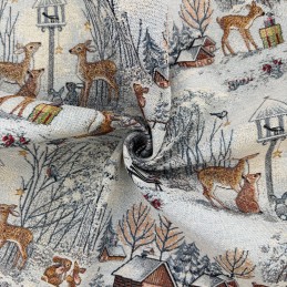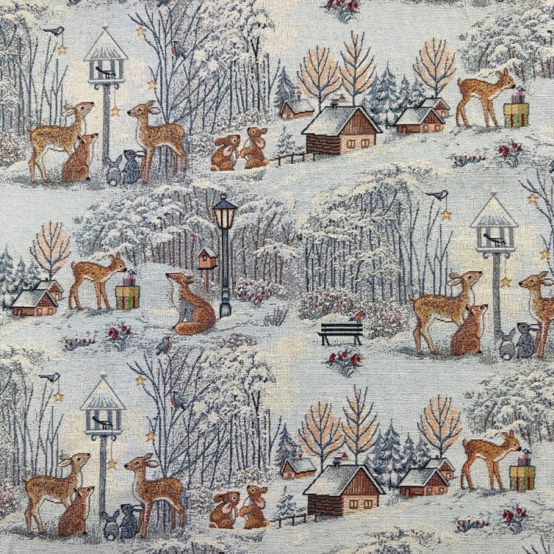 Create a magical seasonal feel with this luxury Winter Wonderland tapestry fabric, featuring beautifully detailed woodland animals, snowy cabins, trees and peaceful winter scenes. The soft neutral tones combined with warm accents give this fabric a cosy and timeless winter aesthetic.