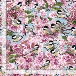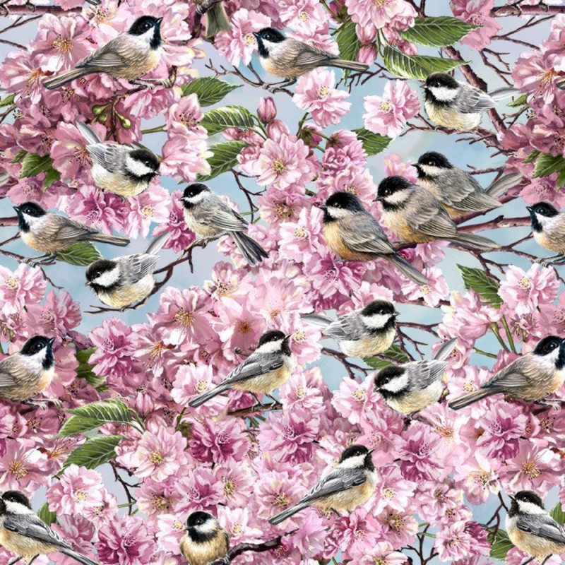 Bring a breath of springtime into your projects with Chickadee on Blossom Tree, designed by Dona Gelsinger for Timeless Treasures. This beautiful digital cotton fabric features delicate chickadees perched on pink blossom branches with fresh green leaves, all set against a peaceful blue sky.