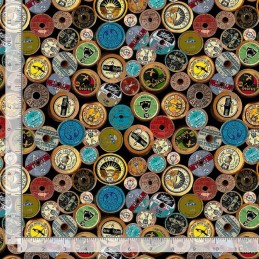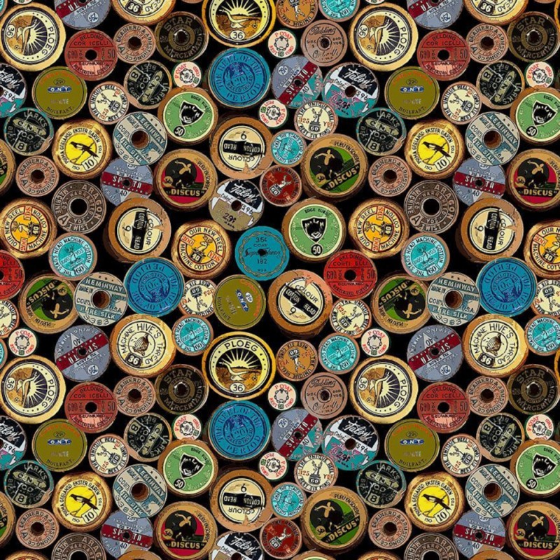 This bold and nostalgic design from Timeless Treasures features a packed pattern of multicoloured vintage-style spool labels arranged over a rich black background. Each label displays classic typography and thread branding, capturing the essence of a traditional sewing room in a vibrant and eye-catching way.
