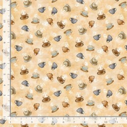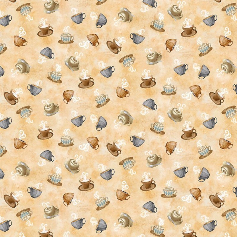 “Tossed Small Coffee Cups” from the Happiness in Cup collection by Timeless Treasures features charmingly illustrated coffee cups with rising steam, playfully scattered on a soft beige background. The balance of whimsy and warmth makes it ideal for coffee lovers and home sewers alike.