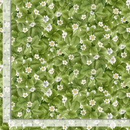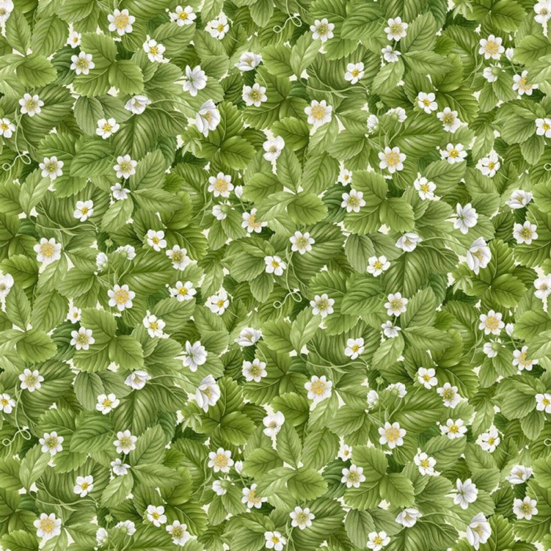 Part of Timeless Treasures’ Berry Sweet collection, “Packed Strawberry Leaves” features a lush, layered composition of green strawberry plant leaves with white blossoms tucked throughout. The print evokes a vibrant, organic feel, reminiscent of a spring garden in full bloom.