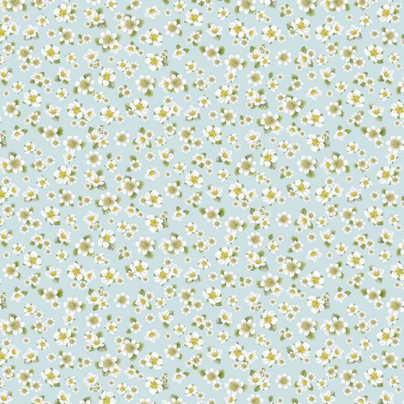 Strawberry Blossoms from the Berry Sweet collection by Timeless Treasures offers a delicate and refreshing floral design. This print features soft white strawberry blossom flowers scattered across a clear sky blue background. With no fruit elements, the focus is entirely on the blossoms, creating a light, breezy floral that’s ideal for spring and summer makes.