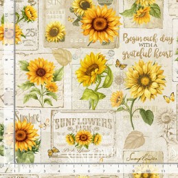 Sunflower Collage by Timeless Treasures features a warm, vintage-inspired design combining large sunflowers, rustic typography, and layered illustrative details. Set against a soft beige background, the layout resembles an old-fashioned scrapbook or botanical journal page, making it ideal for standout focal pieces in quilting or home décor.
