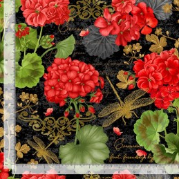 Geranium Dragonfly Collage by Timeless Treasures is a rich and elegant print, showcasing vibrant red geraniums with lush green foliage, gold ornamental scrolls, and scattered dragonflies. Vintage-style text adds a storytelling layer, while the deep black background makes the bright elements pop.