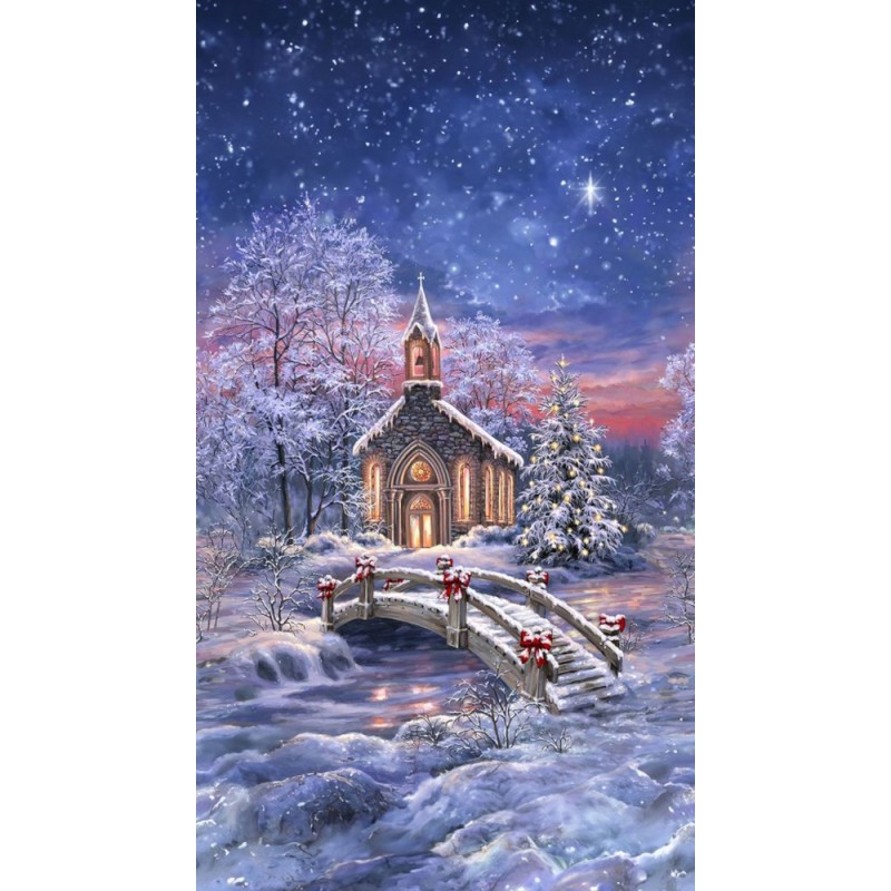 The Snowy Chapel Panel by Timeless Treasures captures the magic of a peaceful winter’s night. This digitally printed cotton panel depicts a picturesque chapel set among snow-covered trees, with a quaint bridge crossing a frozen stream. The design has a soft, painterly style, evoking cosy seasonal charm and timeless elegance.