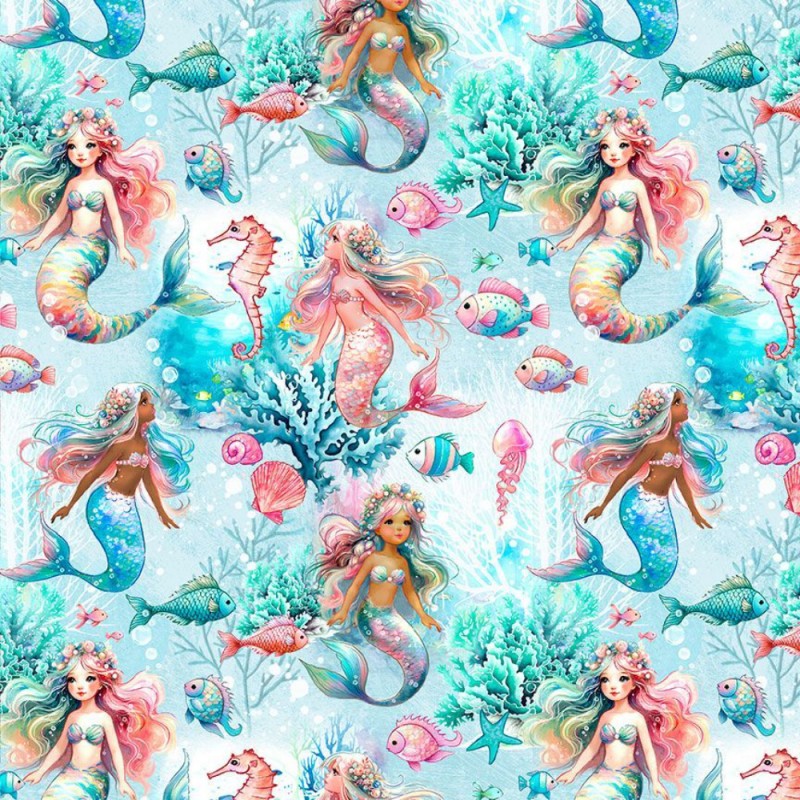 Dive into a magical underwater world with Underwater Mermaids from Timeless Treasures. This 100% cotton digital print features enchanting mermaids surrounded by seahorses, colourful fish, shells, and coral, all brought to life in vibrant colours on a soft cotton base.