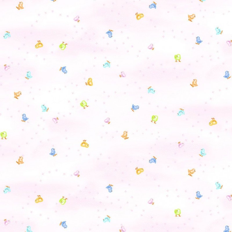 • Features colourful baby chicks scattered across a soft blush background