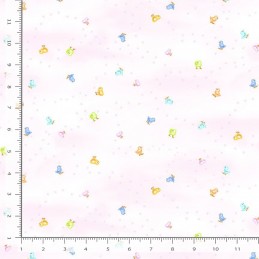 The Timeless Treasures Tiny Chicks fabric (CHARISMA-CD3655 BLUSH) is part of the whimsical Homestead Holiday collection designed by Charisma Horton. This sweet digital print features tiny pastel-coloured chicks in green, blue, pink, and golden yellow, playfully scattered across a soft blush background with delicate footprints.