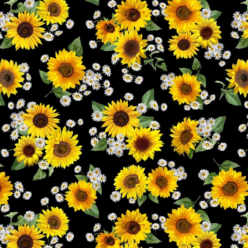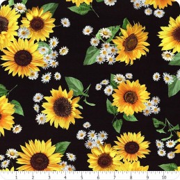 Bring timeless elegance to your sewing projects with the Fleur Sunflowers & Daisies Fabric (CD2924 Black) by Timeless Treasures. This beautiful digital print features radiant yellow sunflowers and delicate white daisies scattered across a deep black background, creating a dramatic and eye-catching contrast.