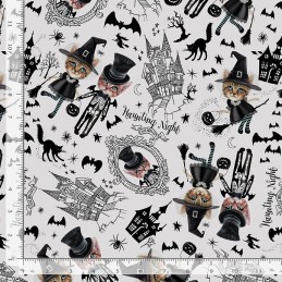 Bring a touch of spooky-cute charm to your Halloween projects with Costumed Kittens – Grey, from the Pick Your Poison collection by Timeless Treasures. This whimsical print features kittens dressed as witches, skeletons, and Halloween tricksters, set against a grey background decorated with haunted houses, bats, black cats, and cobwebs.
