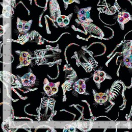Celebrate Día de los Muertos with this striking Tossed Skeleton Cats (CAT-CD3602 Black) fabric by Timeless Treasures. Featuring sugar skull-inspired skeleton cats with intricate floral accents, this playful yet spooky print is set against a bold black background.