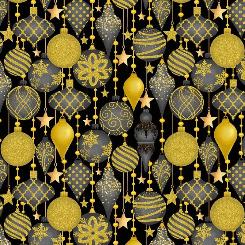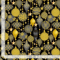 Add festive sparkle to your holiday creations with the Christmas Ornaments Metallic fabric from the Merry Christmas collection by Timeless Treasures. This eye-catching design showcases a cascade of hanging ornaments, baubles, and stars in striking gold and silver metallic accents against a deep black background.