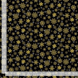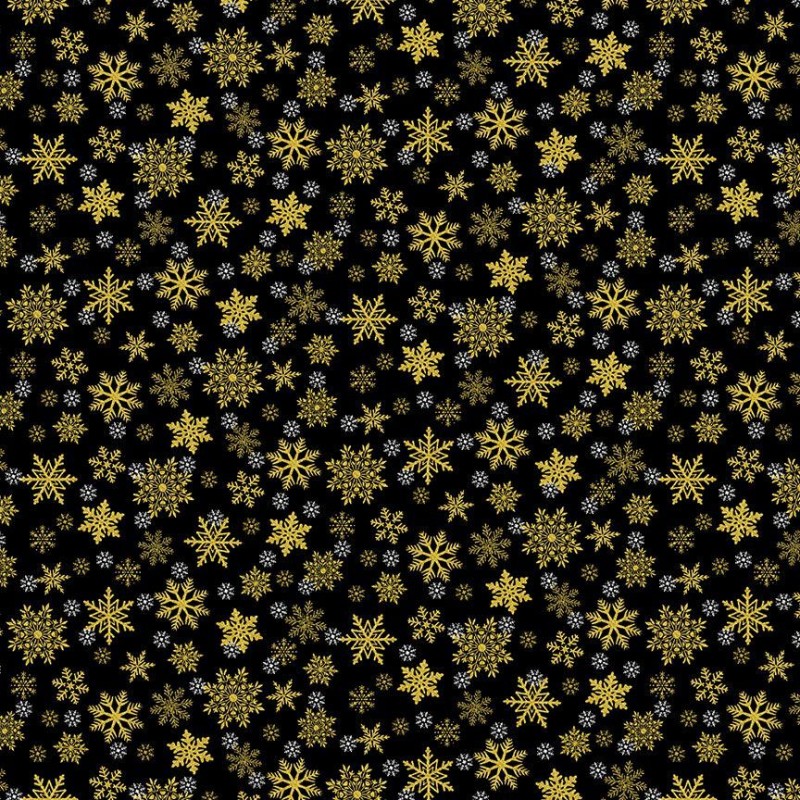 Add a touch of frosty sparkle to your festive sewing projects with the Metallic Snowflakes fabric from the Merry Christmas collection by Timeless Treasures. This striking design features clusters of intricate snowflakes in shimmering gold and silver metallic accents against a dramatic black background.