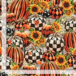 Plaid & Stripe Pumpkin is part of the Bewitched collection, designed by Dona Gelsinger for Timeless Treasures. This elegant autumn-themed print features beautifully painted pumpkins decorated with plaid and striped patterns, surrounded by golden sunflowers and soft foliage. The realistic, painterly style captures the warmth and richness of the harvest season, making it perfect for autumn-inspired makes.
