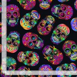 Sugar Skulls is part of the Day of the Dead collection by Timeless Treasures, celebrating the vibrancy and artistry of Día de los Muertos. This striking fabric features a packed print of colourful sugar skulls intricately decorated with flowers, hearts, and swirling motifs, all set against a deep black background for dramatic contrast.