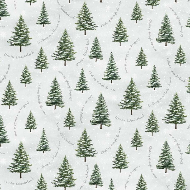 Trees with Winter Scripts from the Winter Wonderland collection by Katie Hennagir for Timeless Treasures beautifully captures the charm of a snowy Christmas day. This serene print features snow-capped evergreen trees surrounded by delicate scripted festive phrases such as “Winter Wonderland,” “Dashing through the snow,” and “Walking on a blanket of snow.” The soft, snowy background enhances the calm and magical atmosphere of the design.