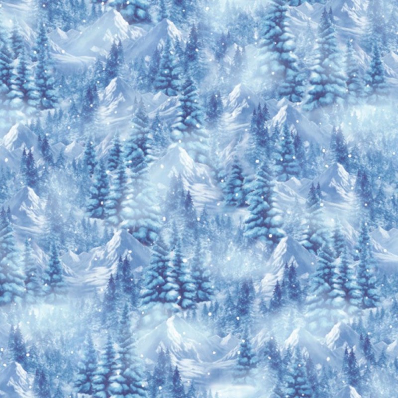 Frost Winter Scenic from the Northern Lights collection by Timeless Treasures captures a serene winter landscape. This print features snow-dusted Christmas trees across a blue-tinted wintery background, creating a peaceful, seasonal scene perfect for festive sewing projects. Its soft, cool tones evoke the crisp beauty of a snowy winter morning.