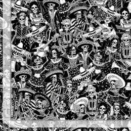 Day of the Dead Toile is part of the Stroke of Genius collection by Timeless Treasures. This striking monochrome print features skeletons in traditional Mexican attire, dancing, playing guitars and trumpets, and celebrating in classic Día de los Muertos style. The artwork showcases fine black and white linework with detailed sombreros, flower crowns, and patterned clothing, evoking a timeless sense of culture and festivity.